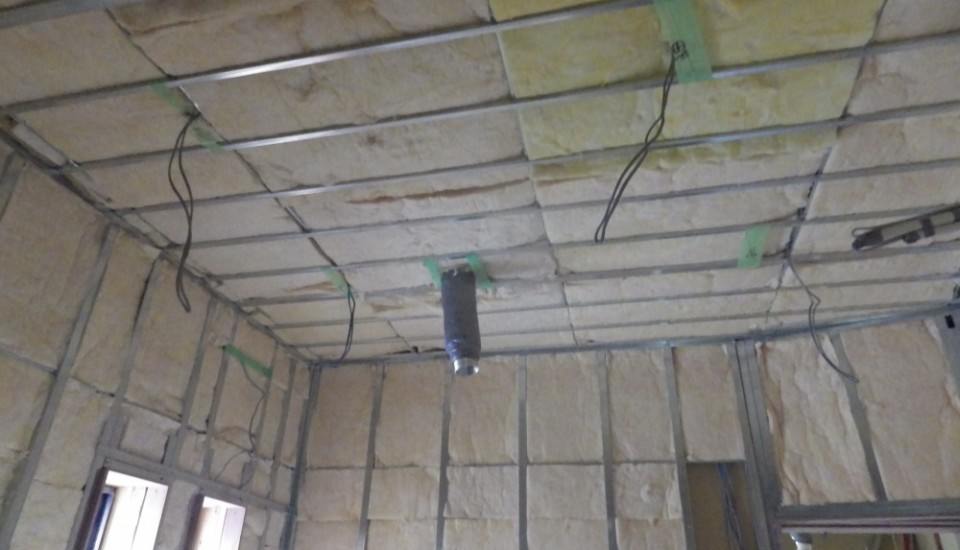 基礎の上に浮き床のスラブを打ち込み、天井も壁も軽量鉄骨で空間を開けて2重に断熱材を入れボードを張り、